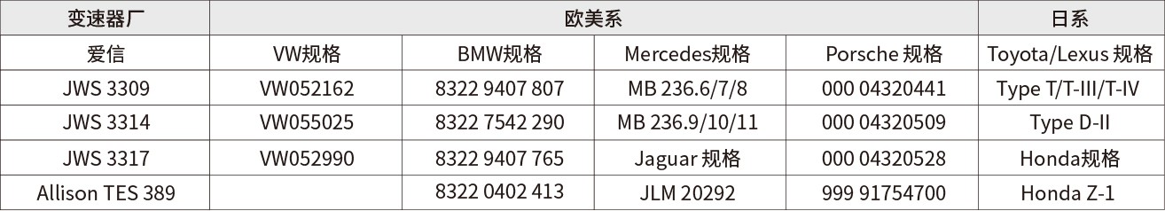 ■ 推荐但不仅限于以下自动变速器的型号及规格: