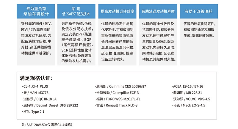 适 用:公路运输重负荷车辆柴油机油,包括安装废气清洁装置的柴油发动机。适用于满足国Ⅵ/欧VI、国V/欧V排放标准的柴油发动机。