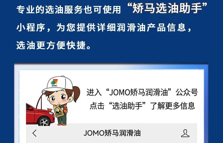 「JOMO 矫马」润滑油产品深受众多消费者喜爱,有「JOMO 矫马」标识的销售店遍布中国,数量超过5000+家,消费者可以方便地购买到矫马产品。