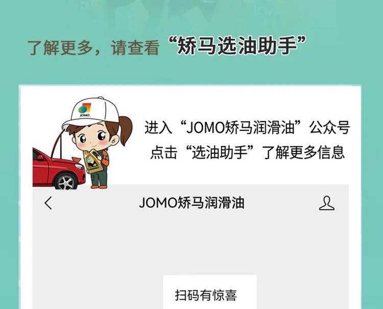 「JOMO 矫马」润滑油产品深受众多消费者喜爱,有「JOMO 矫马」标识的销售店遍布中国,数量超过5000+家,消费者可以方便地购买到矫马产品。
